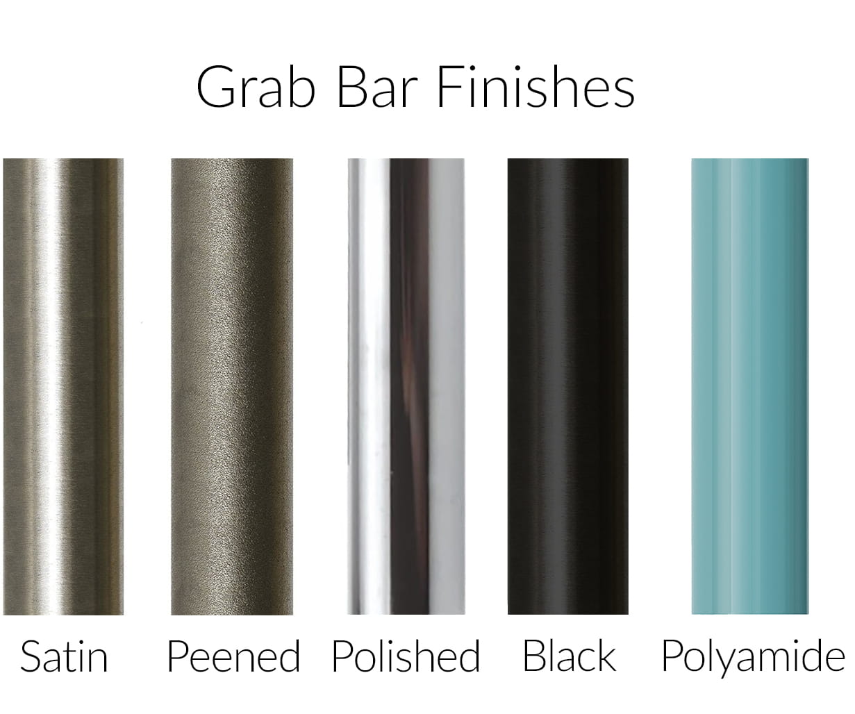 Grab bars are available in a variety of shapes and configurations to suit any space. Shop multiple finish options like peened stainless steel or soft polyamide textures that makes the bar easier to hold onto with wet hands or reduced dexterity.