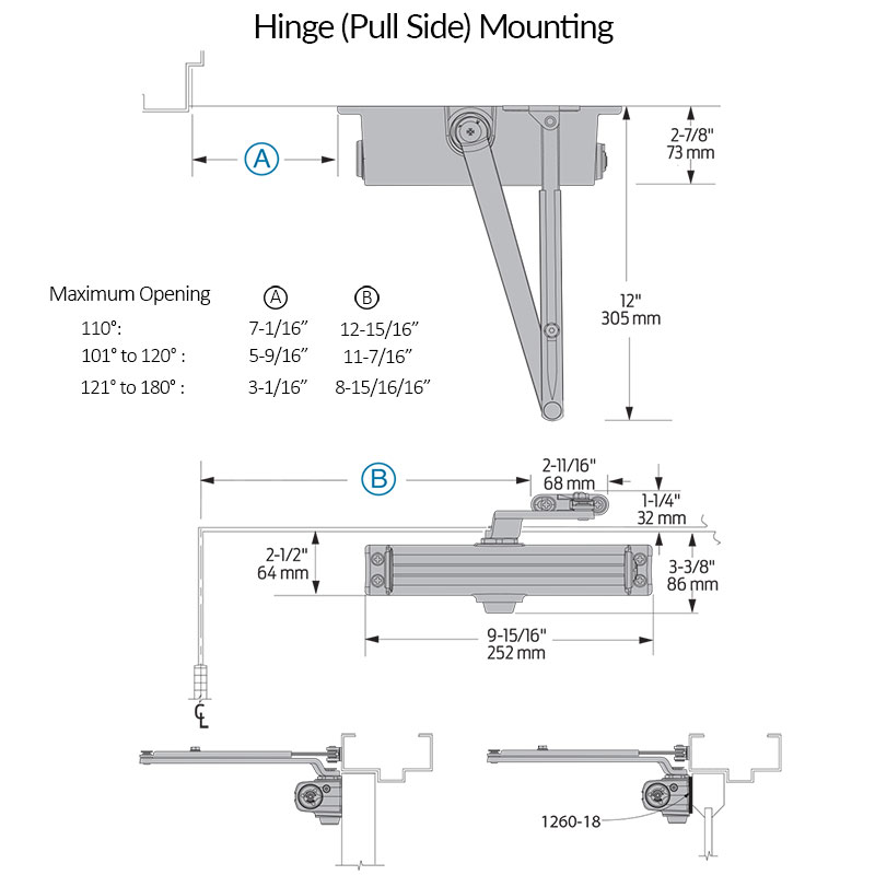 - Mounts hinge side, top jamb, and parallel arm.
