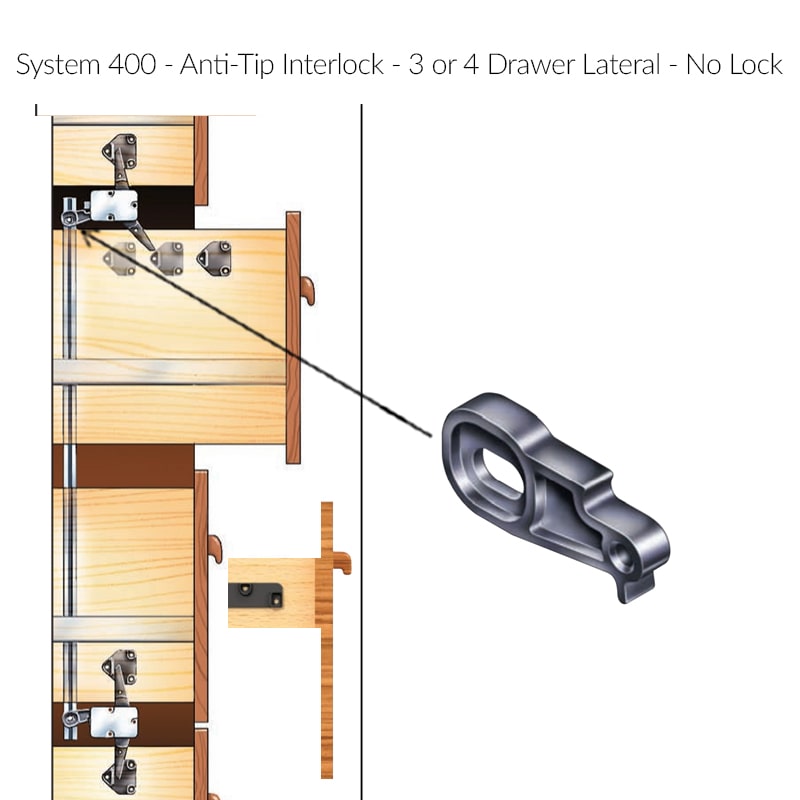 Timberline SN-410 Linkage Arm - Anti-Tip Interlock System 400 easily installs in cabinets or desks with 3 or 4 drawers. Attach to lockbar and snappers to prevent more than one drawer opening at a time.